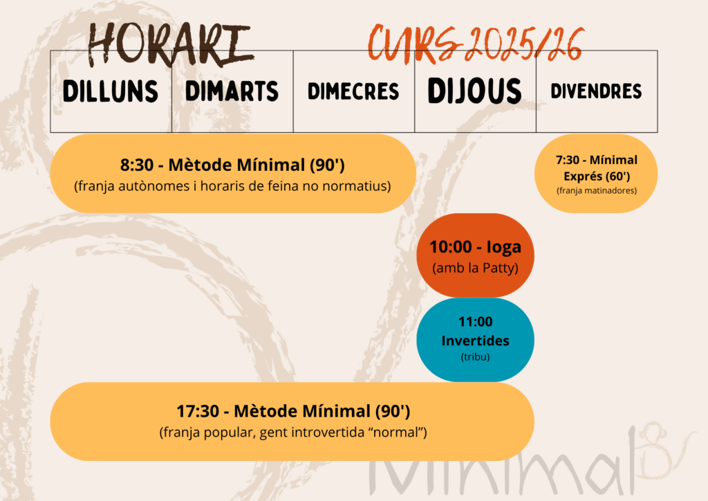 Pensem que el millor per la nostra salut és un moviment ric i divers, per tant, donem valor a la majoria de propostes en aquest sentit. Tot i així, som conscients que la majoria d’activitats físiques no proposen un treball “global”, en molts casos tenen un punt d’especialització. Mínimal ofereix una proposta de base que pot ser beneficiosa per la majoria d’esportistes.
